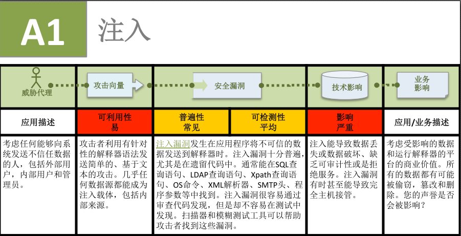 • 注入攻擊漏洞,例如SQL,OS以及 LDAP注入。這些攻擊發生在當不可信的資料作為命令或者查詢語句的一部分,被發送給解譯器的時候。攻擊者發送的惡意資料可以欺騙解譯器,以執行計畫外的命令或者在未被恰當授權時訪問資料。